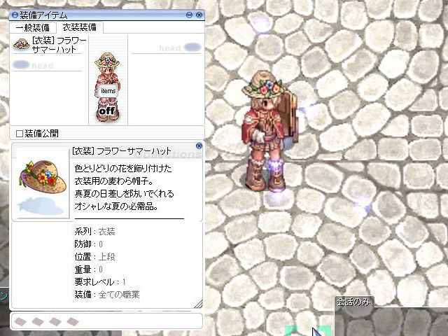 今回の画像を見て気づかれた方もいるかもしれませんが、装備している頭装備(衣装装備)は「[衣装] フラワーサマーハット」だったりします。