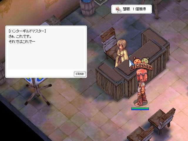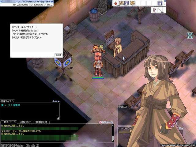 ハンターギルドを出ると、ギルド入口にいたNPC「カエクス」が話しかけてきます。これは「鳥狩セット」と呼ばれるハンター系装備をもらえるクエスト。「鳥狩セット」は、ガンホー社の行ったインターネット生放送のコーナー「出張版RO企画室」で企画発案されたもの。レンジャーのウォーグに注目が集まっているなか、「やっぱりファルコンも使ってあげたい」というファルコン愛好家のプレイヤーのために開発された装備なのです。一連のクエストをこなすと3つの装備品のうちのひとつがもらえ、3回クリアすればセット装備が完成、さらにいつでもファルコンが呼び出せる「ファルコンの笛」が入手できるようになっています。装備の詳細はこちらのページで確認してみてくださいね。