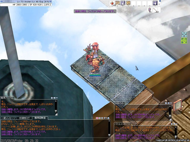 フィゲルへの移動は徒歩で行くとかなり大変。が、幸いにも飛行船が停泊するので、そちらを利用することにします。飛行船の代金はどこまで乗っても1,200Zeny。