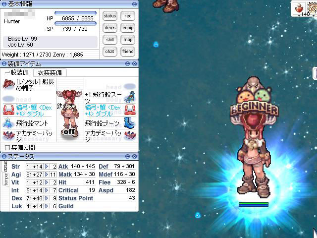 主なステータスタイプとしては、とにかく攻撃速度と弓の攻撃ダメージを追求するAgi-Dexの2極型、スキルによる攻撃を重視したDex-Agi>Int型、ファルコンを中心としたAgi>Luk-Int-Dex型などなど……。なお、ファルコン主体の場合は以前紹介した「鳥狩シリーズ」は揃えておきたいところです。