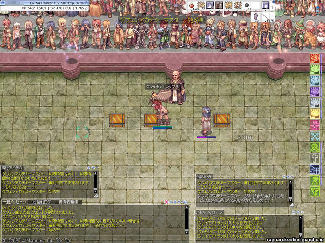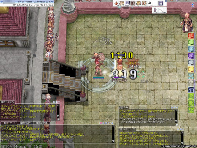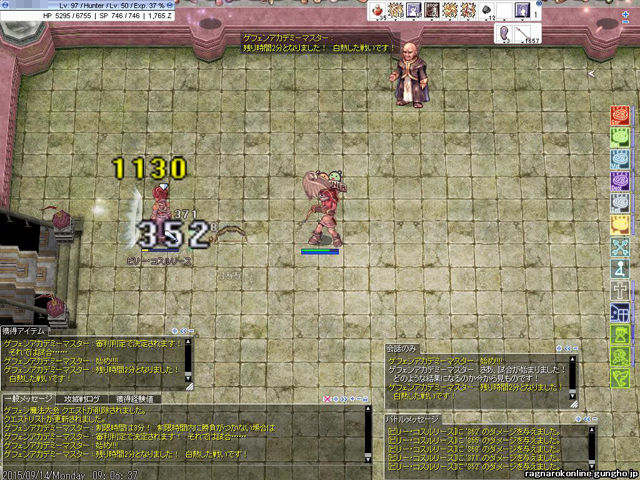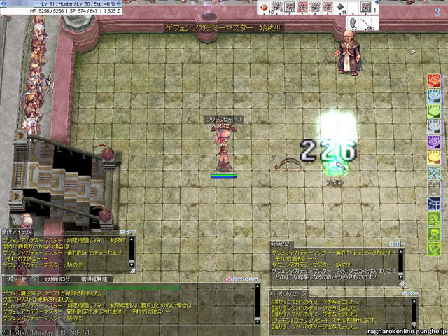 「ゲフェン魔法大会」の詳細に関してはローグ育成編・その3で詳しく解説しているのでそちらを参照願います。育成中のハンターでは、1回戦は楽勝。攻撃していれば終わっている感じです。