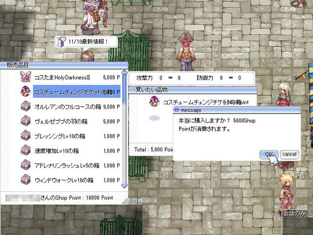 ジェネティックに転職後、倉庫に預けた装備などを回収してプロンテラへ。もうさっそくセカンドコスチュームにしちゃいます。10,000 ShopPointをチャージして、スペシャルアイテム販売員から5,000 ShopPointポイントで「コスチュームチェンジチケットの箱」を購入。箱をダブルクリックして開けると「コスチュームチェンジチケット」が入手できます。