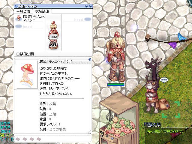 今週は「キノコヘアバンド[0]」入手の支援はなく、通常の方法で入手するしかありません。とは言っても、「きのこの胞子」を300個集め、ゲフェンの制作NPCに持っていくだけという、比較的簡単な内容。「きのこの胞子」は「スポア」や各地のキノコから入手できますね。私の場合は倉庫に保管してあった「きのこの胞子」を引っ張りだしてきてNPCに渡すだけで完了。完成した「キノコヘアバンド[0]」をイズルードの「ドラ猫クロモ」に渡してミッション終了です。