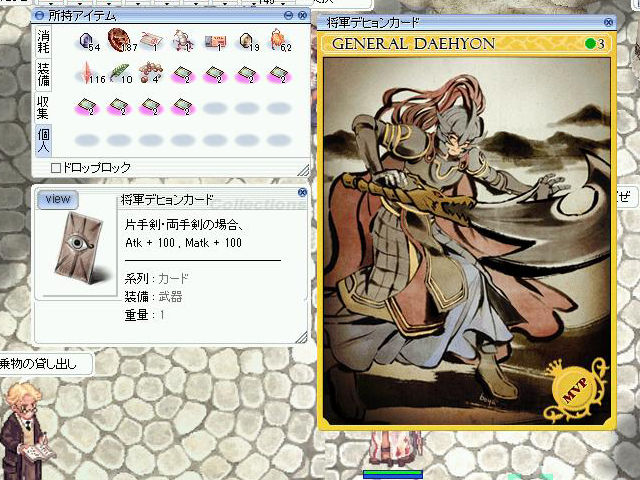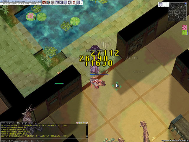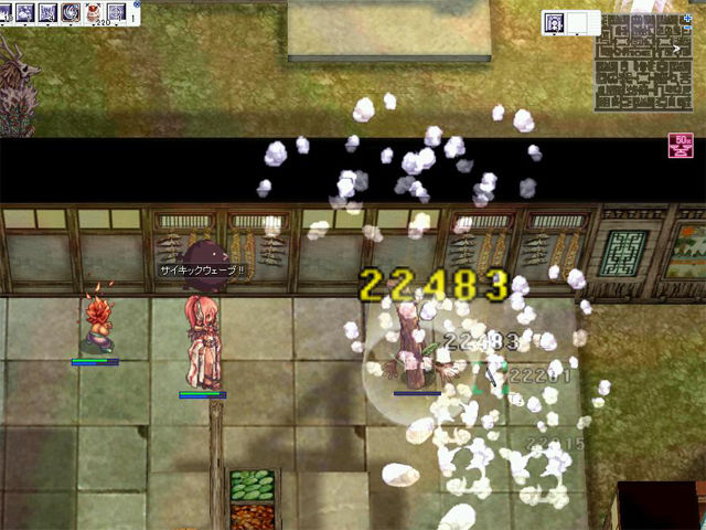 フェイヨン風の建物の中のようなマップで、通路と小さな部屋が入り組んでいる感じ。メインとなるモンスターは「激震のドゥネイール」「地を這うゴーレム」「根付いた天下大将軍」で、討伐対象のモンスターもこの3種類。天女風(?)の「ソヒョン」は少なめ(今回10分程度の滞在時間で1回しか遭遇できず)。「ソヒョン」は風3属性ですが、その他はすべて地属性のため、火の精霊アグニのパッシブモードにより火属性に変化させた「サイキックウェーブ」で狩っていくことができました。また、倒されてから8時間おきに、MVPボスモンスター「将軍デヒョン」が出現するとのこと。