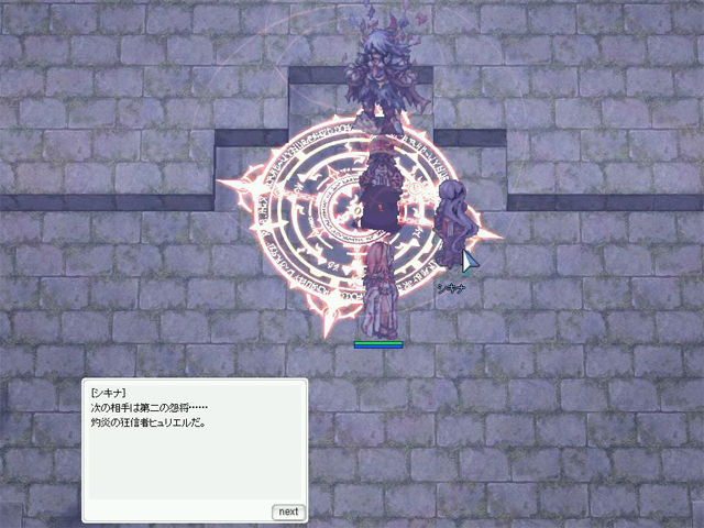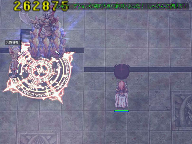 ▲四番目の相手は「煉獄の守護者カデス」。画面全体にアースクェイクのようなエフェクトがいくつも展開され、それを回避するために、シキナの作り出したバリア内に避難しなければなりません。ここのギミックは案外ストレートなのですが、それでも勝つのは至難の業だと思います。