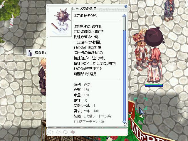 ▲火属性を持つ強力な鈍器、「ローラの鎖鉄球[3]」。「血塗られた鉄球[0]」(または[1])とのセット効果もあり。