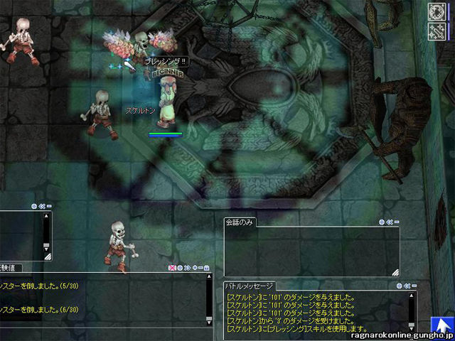 不死属性の敵への「ヒール」はダメージになりますし、不死属性および悪魔形への「ブレッシング」はStr、Int、Dexを半減させる効果があります。特に後者は通称「闇ブレス」と呼ばれ、アコライト育成では有効なテクニックになりますので、覚えておくといいでしょう。