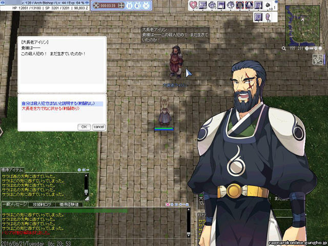 6マップ目はボス戦マップですが、冒頭で述べたとおり、「自分は殺人犯ではないと説明する(戦闘なし)」を選ぶことで、ボス戦を回避できます。大長老アイリンと会話後、ミニマップに示された西側のワープリンクに入れば7マップ目(最終マップ)へと移動できます。