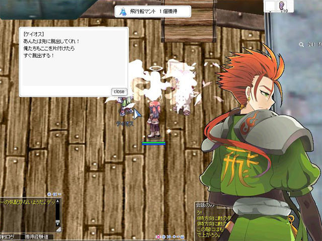 「ワイバーン」戦も「ラピッドシャワー」で手早く終了。ボスは「怒りの船長ペルロック」戦を選んで、同様に「ラピッドシャワー」連打で倒します。運良く「飛行船スーツ[0]」と「飛行船ブーツ[0]」をドロップし、報酬として「飛行船マント[0]」を選択してセット装備がそろいました。まぁ、もともと別キャラでそろえたセット装備を着て挑んだのですが。