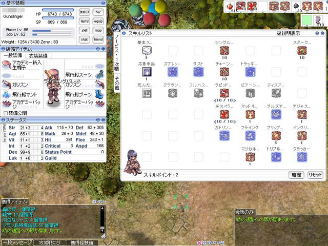 ▲3つのクエストを終わらせると、BaseLv86、JobLv62までアップ。ステータス的にはDexをカンストさせて、主要なスキルもほとんど習得できています。