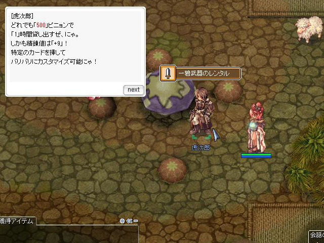 ▲本来はワイルドライダーの姿をしているハズのNPC「虎次郎」からは新規実装の「一碧シリーズ」にカードを刺した状態でレンタル可能。「ボンブータワー」の制限時間と同じ1時間のレンタルなので、迷宮探索には最適。