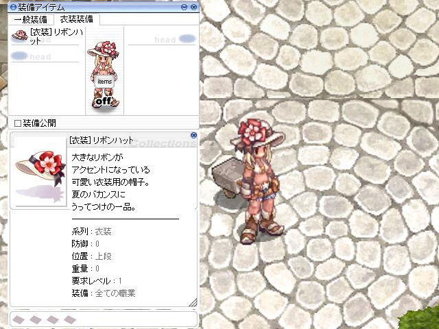 ▲「[衣装] リボンハット」。たまたま手に入れたホワイトスミスで撮影しましたが、もうちょっと露出の少ないキャラのほうがよかったのかも(苦笑)。シルエット的に、あまり見ないタイプの衣装装備なので、被っていると注目されるかもしれませんね。