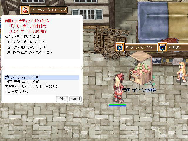今週は入れ替え期間ですが、いつもの「ドラモ マシーン」が活躍(?)する「コスチュームミッション」での討伐クエストの際には転送に5,000zeny要求されるので、ちょっと不安が……。しかし、今回の転送は無料! 不安は杞憂でした(笑)。