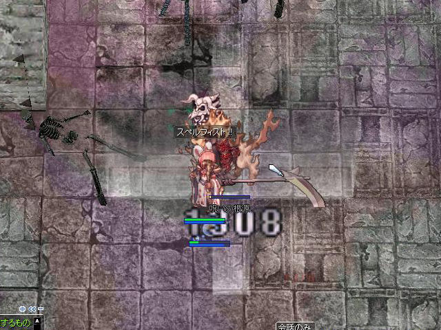▲「呪いの剣士」のボス「呪いの根源」のこのスキル攻撃(通称、グランドダークネス、闇GXなど)は、普通に食らってしまうと大ダメージを受けますが、闇属性の鎧を装備していれば無効化できるので、覚えておきましょう。