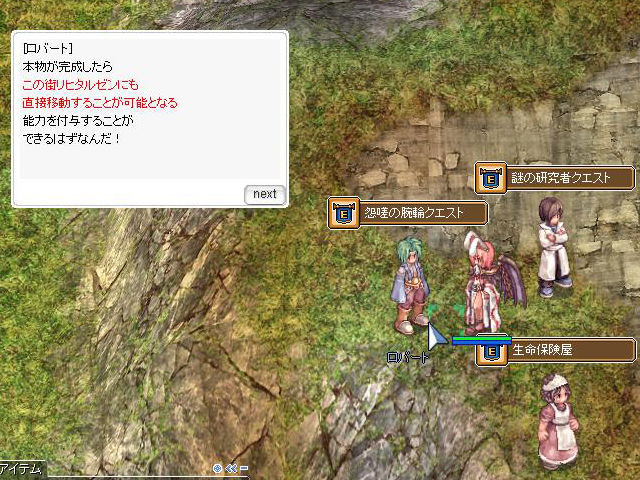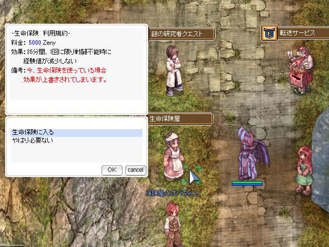 ▲現地にはおなじみ「保険屋のオバちゃん」もいるので、デスペナルティが不安という人は5,000zenyで保険に入っておくといいでしょう。