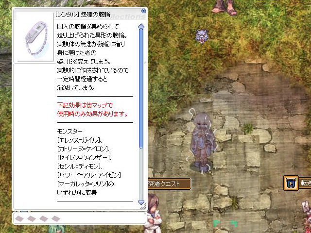 必要な「囚人の腕輪」の数は500個! 「多いよ!」と思った人は、「生体工学研究所:獄」アップデートを未体験と見ました。実は「囚人の腕輪」はかなりドロップ率が高く、モンスターによっては100%近いのです。さらに、前述したように、「生体工学研究所 01」にいる「リムーバ」は出現数がかなり多くなっていて、犬も歩けば棒に当たる的に、「テレポート」すれば大量の「リムーバ」に当たるという感じ。「リムーバ」はそれほど強くはないモンスターですし、500個集めるのも大変ではありません。