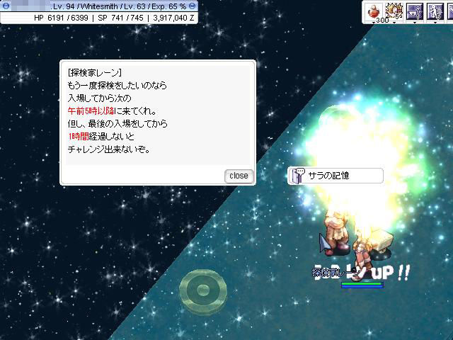 あまりにもサクサクと稼げてしまうので、メインとしているワールド以外にいる、ほぼ放置しているキャラで何回かダイス勝負をしてみたのですが、上位2次職の何体かのキャラではBaseLvが99近くに……。さすがにJobLv70にするには少し足りないようなので、「英雄の痕跡」の「サラの記憶」をクリアしてJob経験値を稼いでみました。こちらでも紹介しているように、上位2次職の場合、「サラの記憶」はJob経験値特化の稼ぎ場所。何回か繰り返しクリアしていればすぐにJobLv70になるので、イベント期間中には3次職に転職できてしまいそうです。