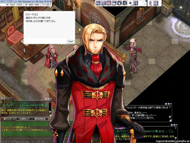事前情報どおり、新マップである「侵攻されたプロンテラ」、「プロンテラ地下監獄」、メモリアルダンジョンの「空中要塞」と「最後の儀式の間」に行くにはメインクエスト「七王家とユミルの心臓」を進める必要があります。初めてクエストを進めるキャラでは多少時間はかかるかもしれませんが、わかってしまえば案外短時間でクリアできると思います。