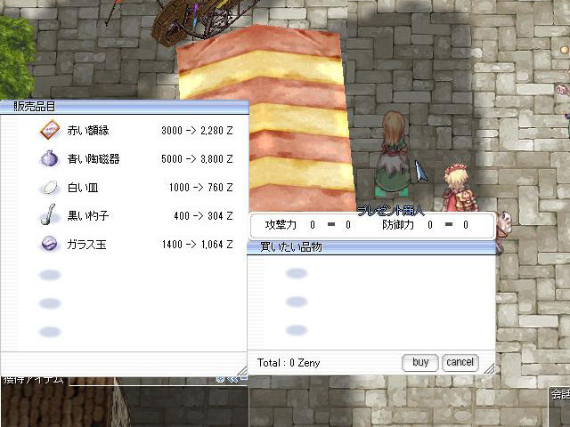▲「サークレット[1]」が手に入ってしまえば、残る材料である「ガラス玉」はプロンテラなどにいる「プレゼント商人」から購入できます(もちろんモンスターからのドロップを狙ってもいいのですが)。