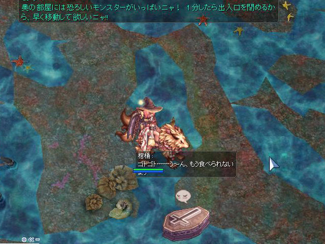 「ウェルス アイアン・フェスタ」自体は基本的には昨年の精錬イベント同様、メモリアルダンジョンに赴き、内部に設置された棺桶(棺桶型NPC)状態で寝ている幻燈鬼(今回は「メカ幻燈鬼」らしいです)を叩き起こして“記録”してもらいます。その後、イベント会場のNPC「プルット」に報告してイベントのポイントである「ナルト」をもらい、その「ナルト」を使って精錬、そして数日に1回到来する「オーバーリミット」時には、装備品が消滅しない「ミラクル精錬」や、装備から装備へとカードを移動させる「合成精錬」、装備品からカードを消滅させて外す「リストア精錬」などの特殊精錬を行うことも可能です。