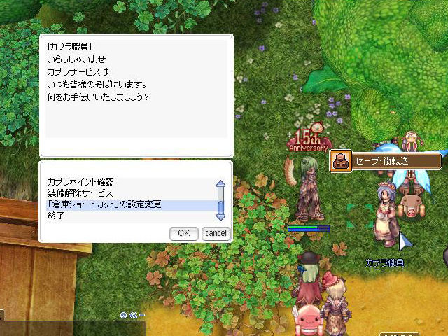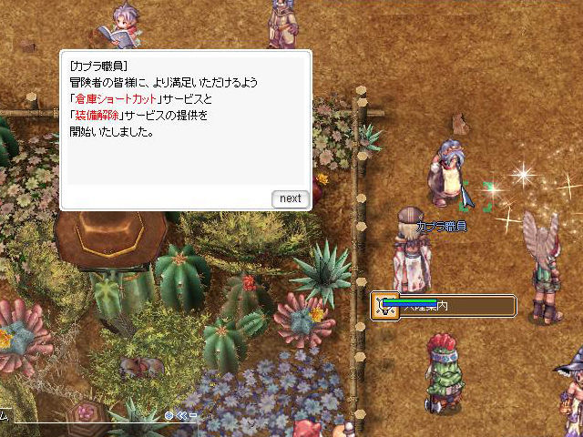 すでにログインしてNPCのカプラ職員などに話しかけた人はご存知のとおり、各街などにいるカプラサービスやジョンダサービスのNPCに「倉庫ショートカット」と「装備解除」サービスが追加されました。