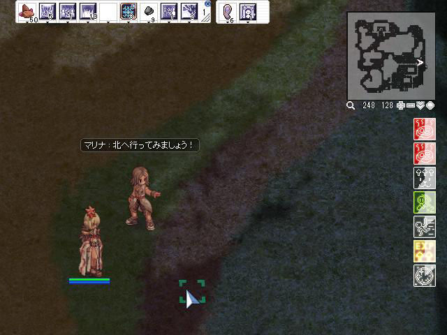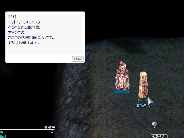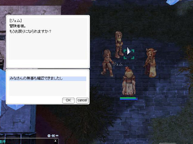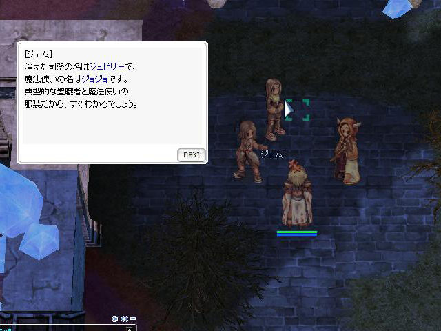 ▲ノートの内部には「ゲフェン地下ダンジョン B2F」と似た世界が広がっていました。転送地点のすぐ北側にいるNPC「ジェム」に話しかけると、いなくなったメンバーを探しに行くことになります。