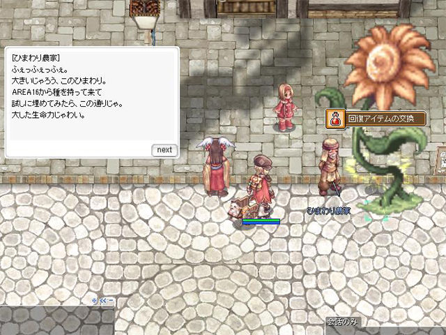 今回はひまわり農家のおじいさんだけかと思いきや、「スーパーひまわり」そのものをプロンテラに植えてしまっています。道端にこんな奇怪な植物が植えられていては通行人もビックリだと思うのですが……(笑)。