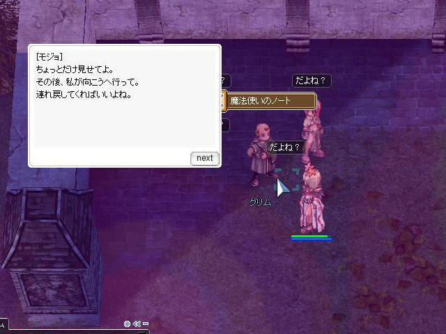 ▲NPC「グリム」に話しかけると、マジシャンらしき「モジョ」との言い争いに巻き込まれます。なんだかんだで、魔法使いが残したノートの内部に行くことに。そこそこ会話が長いので、会話中に敵が襲ってきたりしますが、このマップ程度ならBaseLv170のキャラクターであれば気にならないはず。