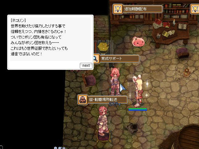 キャラ育成と言えば、2019年早々の新企画として、「3次職マスタープログラム」が実装されました(詳しくはこちら)。これは、ドラムではおなじみ、「ドラム育成サポートプログラム」の3次職版といった感じ。ご存知、ポリン団の「ミスティ」と「ネコリン」が世界征服のための調査と称して、ポリン団のメンバーとなった冒険者に世界を股にかけた冒険を依頼してきます。基本的な内容は「ドラム育成サポートプログラム」と同様で、ストーリークエストやアドベンチャークエストを達成してくることで経験値や報酬アイテムがもらえます。