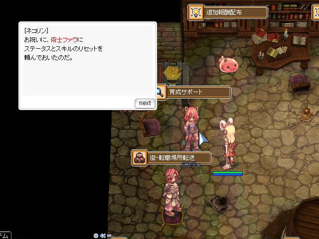 ▲クエストなどに使える転送装置は60日限定などなど、説明を聞きつつ会話ウィンドウを送っていると、BaseLv100を越えたお祝いに再びステータス&スキルリセット権がもらえました。いや待ってよネコリン、この権利枠、1回分の権利を上書きするだけだよね(苦笑)!
