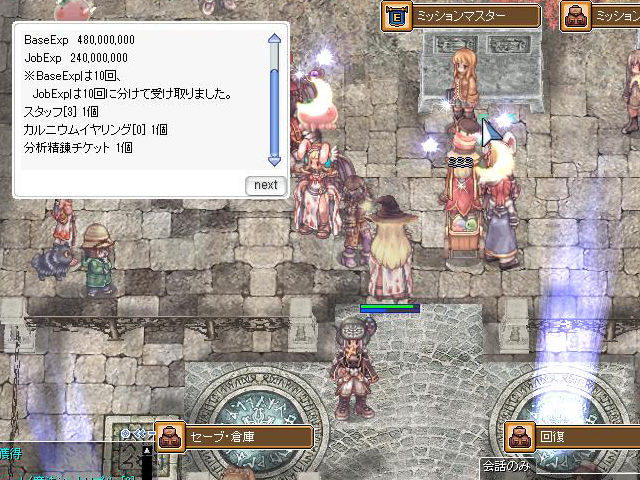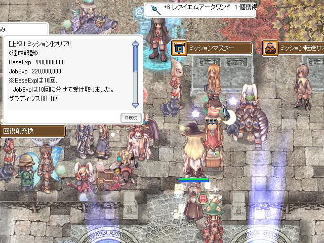 上級1の各ミッションではBase経験値8,700万、Job経験値4,350万が獲得でき、なかなかの報酬に。また、上級1の3つのミッションをクリアするとBase経験値4億4千万、Job経験値2億2千万、<フェイタルスモール>(小型へのダメージアップ)付きの武器(選択)、「怨嗟の腕輪[0]」、「+6 レクイエムスーツ[0]」、「+6 レクイエムローブ[0]」、「+6 レクイエムシールド[0]」、「+6 レクイエムマント[0]」、「+6 レクイエムブーツ[0]」、「+6 レクイエム武器」(選択)、そして分析精錬チケット(権利)がもらえます。