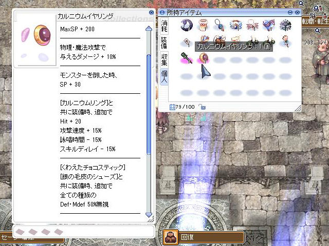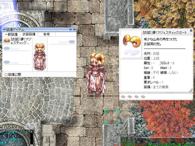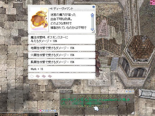 ▲肩にかける物に<R-Fire>トリプルの「エクセリオンウィング[0]」(「ピオニーマミーのフード[0]」でもいいかも)。流通価格高めの装備は「+7 ガーデンオブエデン <詠唱妨害不可> [1]」と画像の「+7 エクセリオンレッグ[0]」、「マジカルリング[1]」くらいでしょうか。「シロマカード」挿しの「ヤナ スモールブックペンダント[1]」もあるのですが、装備する隙間がありません(笑)。