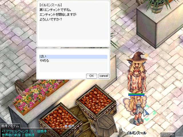 ▲「受付嬢」で交換した装備品には、同マップ内にいるNPC「イルミンスール」にて世界樹エンチャントが可能。エンチャントを行うには200YEPで交換可能な「世界樹の新芽」が必要です。精錬値が+8以上だと特別なエンチャントがつく可能性もあるのですが、とりあえず「+7 アクセルウィング[1]」で試してみたところ、<DEF+12>と<ハイレベル>がつきました。
