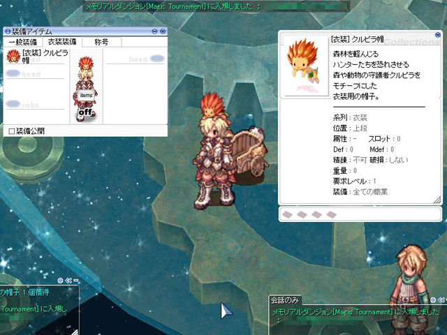 今回のイベント、毎週対象場所が変更になるということは、予定されているメモリアルダンジョンをクリアできるほうがいいですよね。メモリアルダンジョンのデスペナルティは健在のようですから、BaseLv174で追い込み中のメインキャラ(ソーサラー)で挑戦するのはやや不安が残ります。それに、私のソーサラーではまだ「ゲフェン魔法大会」で決勝戦まで進んだことがないんですよね(笑)。
