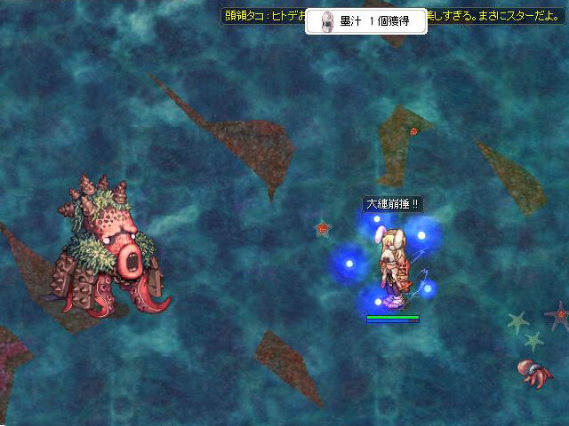 「頭領タコ」は、HPが少なくなってくると、キャラが隣接しているときに、この「アースクエイク」を行ってきます。詠唱時間は1秒ほどありますが、効果範囲が広いため、詠唱が始まってから全力で離脱しても逃げられるかどうか微妙なところです。