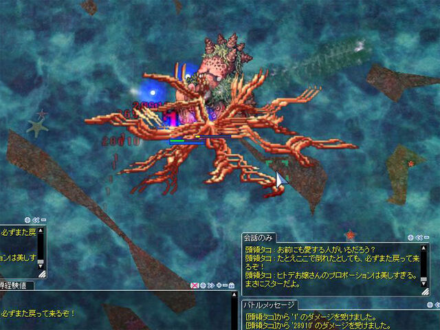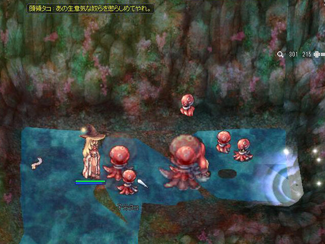 「頭領タコの足」は接敵して攻撃を行うと、さまざまなスキルを使用してきます。ほとんどは詠唱妨害が可能ですが、こちらのAspdが低いと発動を許してしまうこともあります。注意したいのは詠唱時間が短い「ワイドスリープ」(睡眠)からの「ワイドソウルドレイン」(SP吸収)。SPを吸収されてしまうと強力なスキルを連打できなくなるため、意外な苦戦を強いられることがあります。