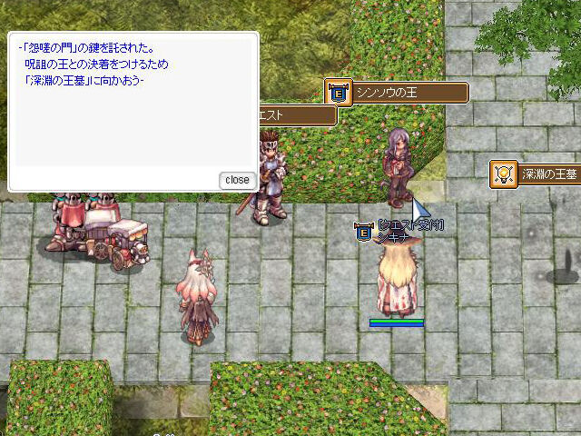 謎の人物との邂逅を終えると、元のマップに戻されました。そのまま「シキナ」の元に行ってみますが、特に変化はありません。「クエストリスト」を確認してみると、まずは「シンソウの王」クエストをクリアする必要があるみたいです。まぁそんな予感はしていましたが。
