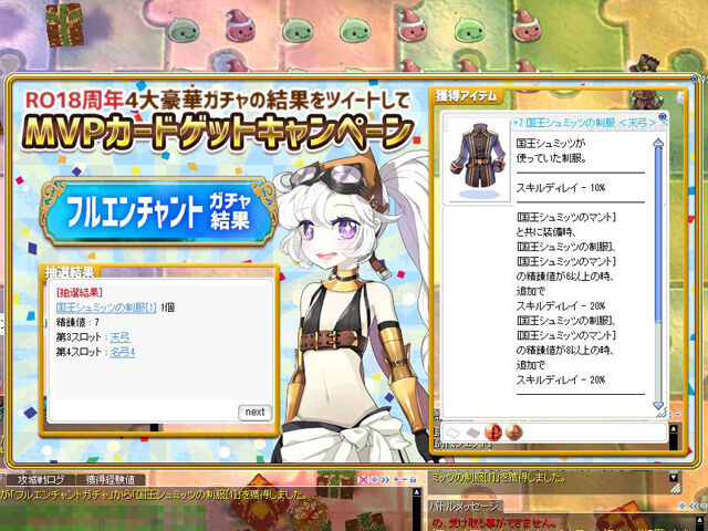 ▲大当たりを引いたのはフルエンチャントガチャ。「+7 シュミッツの制服<天弓><名弓4>[1]」でした。密かに期待していたZenyガチャは1000zeny小為替10枚、MVPガチャは「封印されたクトルラナックスカード」でしたが……。