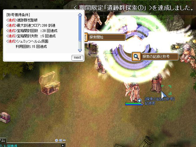 ▲スゴロク風アトラクションの「廃亡遺跡群」では各種実績項目がクリアでき、それぞれに応じた称号も獲得できます。これはアカウント単位で記録されているため、同一アカウントの他のキャラクターはイベント会場にいる「記録官」で達成状況を確認することで実績が達成されます。