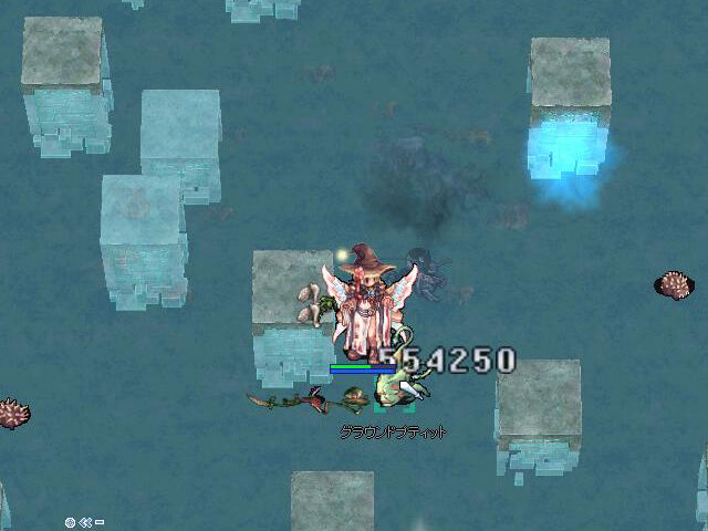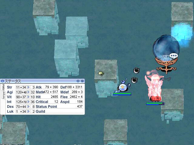 ちなみに、今回、運よくオーブの支援を受けることができました。オーブのあるフロアでは、フロア内にいくつかオーブが存在しますが、同一フロア内ではオーブの支援は1回しか受けられないようです。オーブの効果自体は30秒くらいでしょうか。わりと短いですが、HitやFlee、Defが見たこともない数値になっていました。