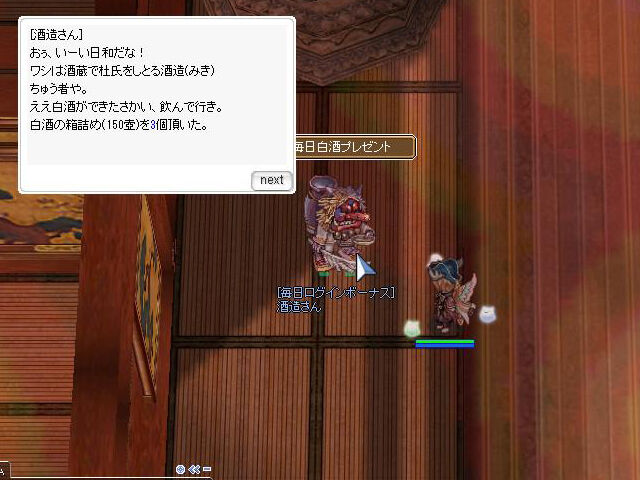 ちなみに、今年も回復アイテムはかなり大盤振る舞いしてくれていて、「酒造さん」に話しかけることで、1日1回、「白酒」を150×3セット、ストックしてくれます。受け取らなくても、話しかけるだけでストックを増やしてくれるので、ログインしたらまずは「酒造さん」に話しかけるようにしましょう。なお、ストックは午前5時更新です。