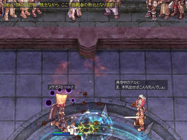 ▲「ゲフェン夜間闘技場」では観客席にいる「険しい顔の男」に話しかけて対戦スタート。制限時間はわずか30秒。そのうえ敵もかなりHPがあり、倒すのは難しくなっています。「ゲフェン魔法大会」と同様、相手を倒しきれないとプレイヤーの負けになります。
