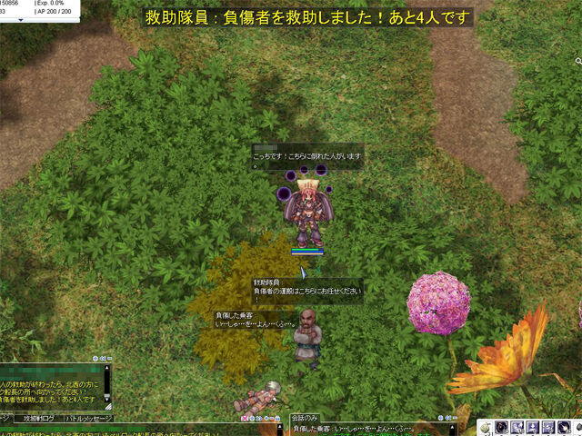 ▲「飛行船墜落地」前半では負傷者の救助を行います。要救助者の数はパーティーメンバーの人数に応じて変わる感じでしょうか。ソロで挑んだら5人の救助が必要と言われました。救助自体はクリックすればいいだけなので、近くまで寄る必要はありません。