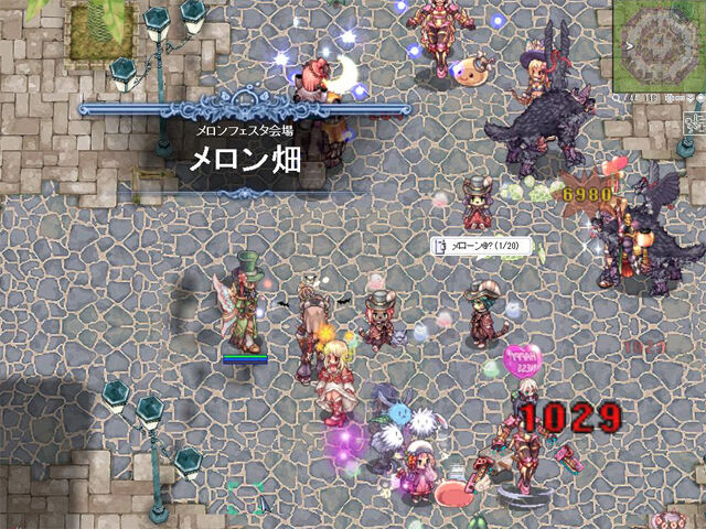 ▲「メロンフェスタ会場(メロン畑)」では臨時パーティーを組むことでパーティーメンバーが敵を倒すごとにアイテム獲得の可能性が発生。ソロよりも断然効率よくアイテムを獲得することができるようです。なお、10月17日(火)の定期メンテナンス終了後からはマップ内の仕様が変更され、オートスペル系のスキルも発動しなくなっているようですのでご注意を。