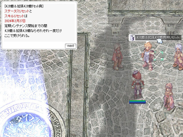 さてさて、2月27日(火)の定期メンテナンス開始時といえば、ゲーム内でもいくつかのイベントなどが終了予定になっています。まずは拡張4次職の実装に合わせてステータス&スキルリセットが可能なNPC「4次職&拡張4次職リセット員」が撤去されます。拡張4次職はもちろん、4次職でもステータス&スキルリセットが1回だけ可能になっていますので、利用を検討している方は忘れずにリセットしておきましょう。悩んだらとりあえずリセットしておくというのもひとつの手です(その後、振り間違えないように注意が必要ですが)。