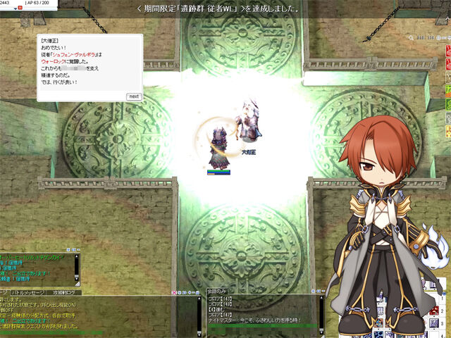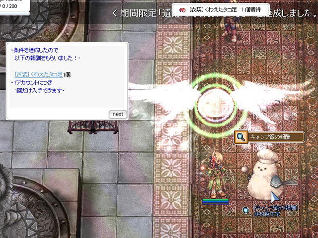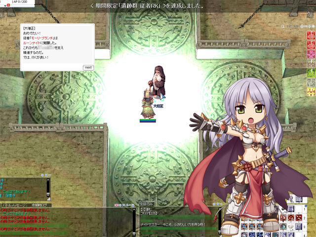 一方の「突然の来訪者」は、メインストーリークエスト「賢者の遺産」クリア後に受注できるクエスト(バルムント邸の飛行船発着場前に出現する「クルックス」から)。長らく王位不在だったルーンミッドガッツ王国に新国王が誕生するという内容で、クエストとしてはとても短いもの。報酬に関して、経験値はともかくとしても「王家貢献の証」が100個ももらえるので、できることならスキップせずにクリアしたいところです。おそらく、このクエストは「祈りの方向」の前提クエストになっているため、クエストスキップに対応になったのだと思われます。