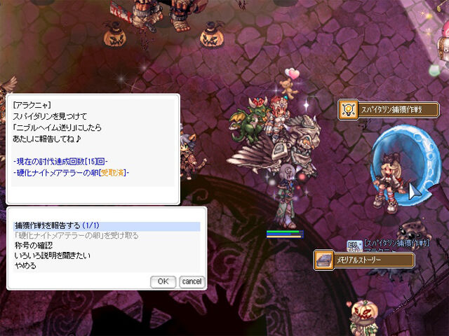 ▲プロンテラ南西付近にやってきた「夏美」。毎年のことながら冒険者にお手伝いを依頼してきます。討伐クエストでは何気に先日まで行われていた「スパイダリン討伐」と同等の経験値報酬がもらえるので、レベリングにも最適です。