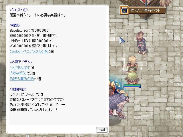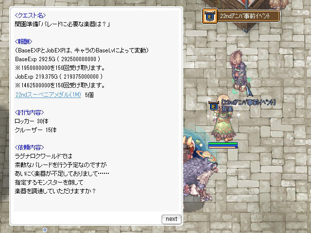 具体的には毎日提示される討伐クエストと納品クエスト(午前5時に切り替え)をこなしていくことで、Base&Job経験値とイベントで利用可能な「22ndスーベニアメダル」がもらえます。