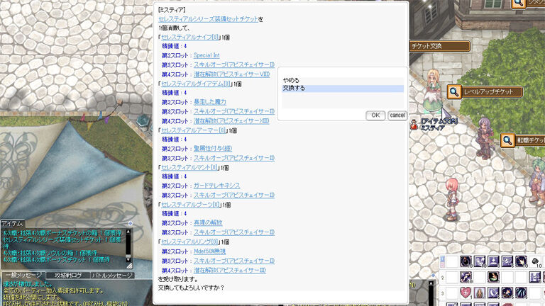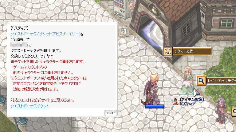 ▲今回は「4次職・拡張4次職スターターパック」を導入したので、「クエストボーナスAチケット(アビスチェイサー)」をもらい、キャラに権利を付与。BaseLvがある程度高いので一部のクエストによる追加の経験値はもらえませんが、セレスティアル装備精錬用の各種メダルなどを集めておこうと思います。