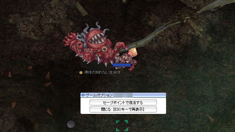 最初はメインキャラのエレメンタルマスターで行ってみました。前半部分をクリアできるのは予想できていたのですが、十分な耐性装備がそろったこともあり、かなり余裕に。後半戦への中間地点、洞窟内の安全地帯で「ミニスパイダリン」を倒し、ひとまずノルマ完了。ついでに、ものは試しと後半部分にも挑んでみたら、まったく苦労せずに最後のボス「得体の知れない生命体」を倒せてしまいました。